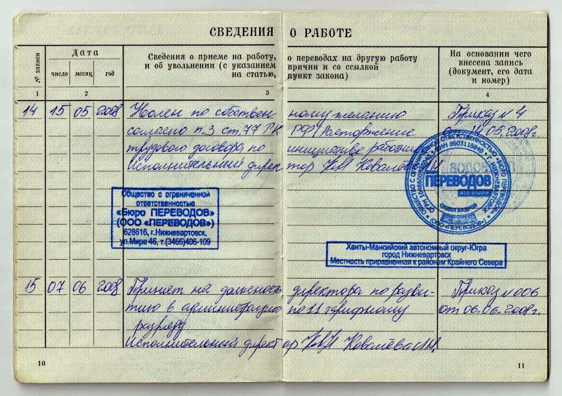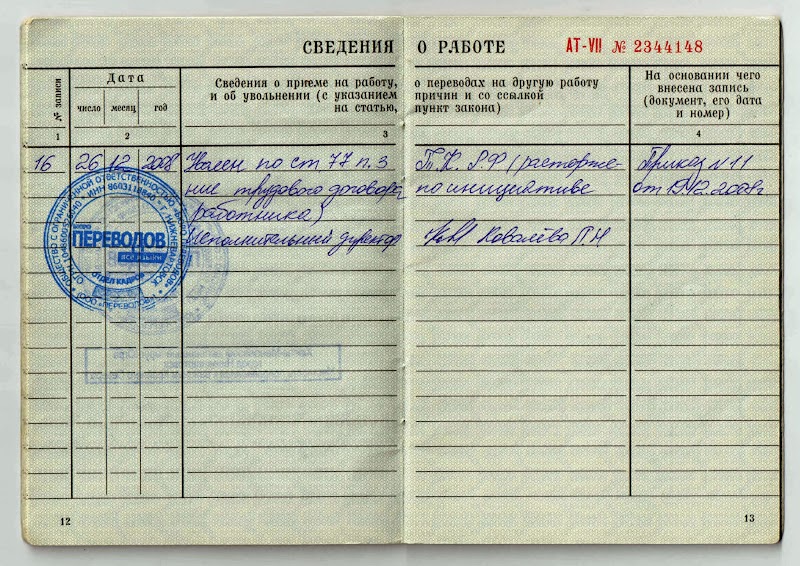 УвольнениеПорядок внесения записи об увольнении также остался прежним. Как и прежде, отмечается, что запись о причинах увольнения вносится в точном соответствии со статьёй Трудового кодекса. При внесении записи об увольнении все записи работодателя заверяются подписью лица, уполномоченного вести трудовые книжки, а также печатью работодателя при её наличии.