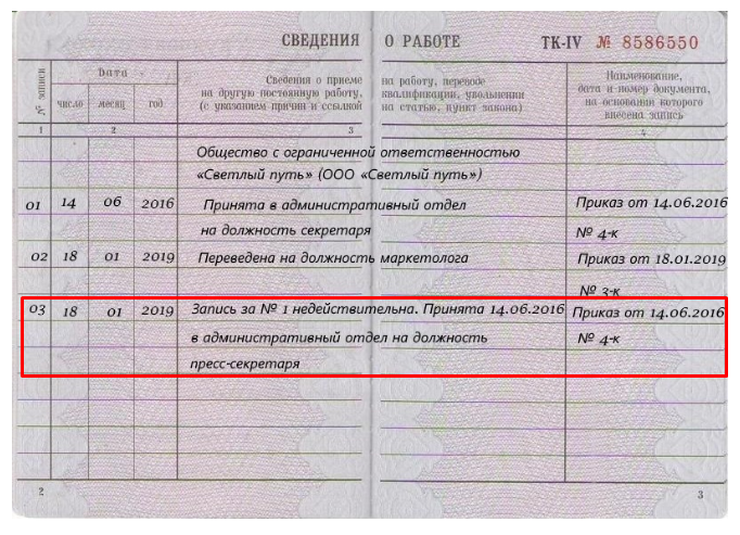 Зачеркивание некорректных и неправильных записей на страницах, связанных непосредственно с самими сведениями о работе, ни в коем случае не допускается. В этом случае следует указывать на изменения на строках ниже, а также исправлять неправильные записи посредством ссылки на номер той самой некорректной записи и слов «запись №… недействительна».